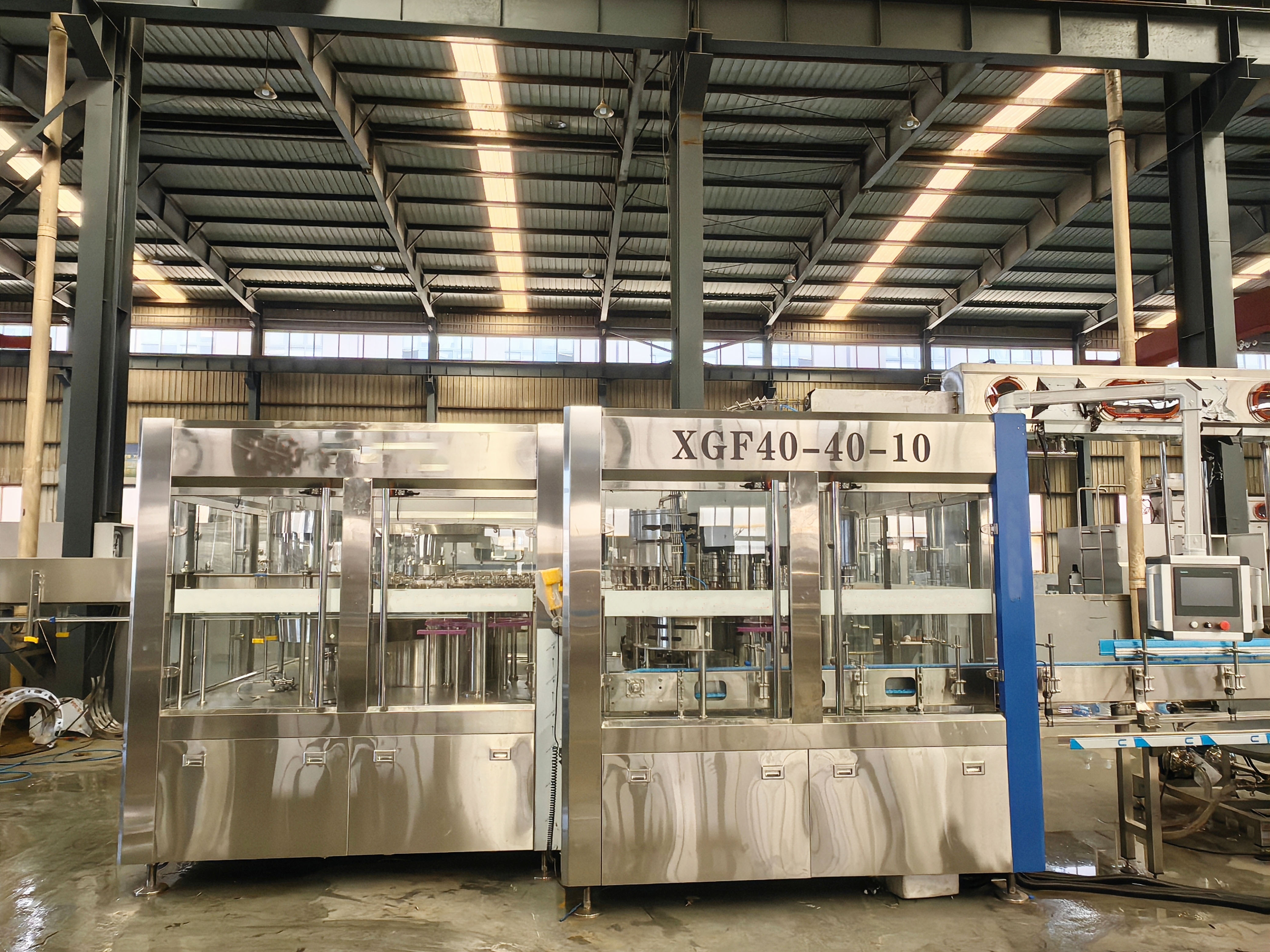 XGF40-40-10三合一灌裝機主要用于礦泉水、純凈水的灌裝作業(yè)。本機將沖洗、灌裝、旋蓋三功能合在一個機體上,全過程實現(xiàn)自動化。適用于聚酯瓶、塑料瓶,各部分的適用瓶型調(diào)整采用手柄轉(zhuǎn)動實現(xiàn),輕松自如,簡便快捷。灌裝方式采用了新型的常壓灌裝,使灌裝速度更快更穩(wěn)定,所以與同規(guī)格的機器相比本機的產(chǎn) 量更高,效益更大。本機采用了先進的可編程控制器(PLC)控制機器的自動運行,進瓶鏈道采用變頻器調(diào)整,與主機變頻器相互配合使進瓶運行更穩(wěn)定可靠,光電檢測各部件的運行狀況。自動化程度高,操作簡便。是礦泉水、純凈水生產(chǎn)廠家理想的首先設(shè)備。